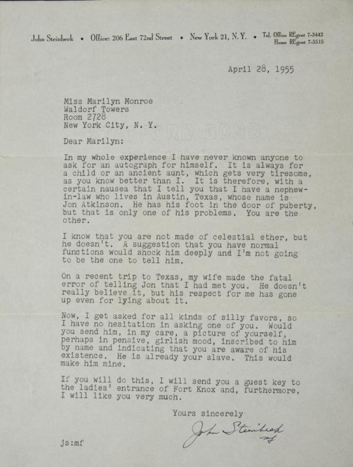 I was thinking of him yesterday when I saw this letter which John Steinbeck wrote to Marilyn Monroe. It’s just a simple request for an autograph but it’s better written than most novels.