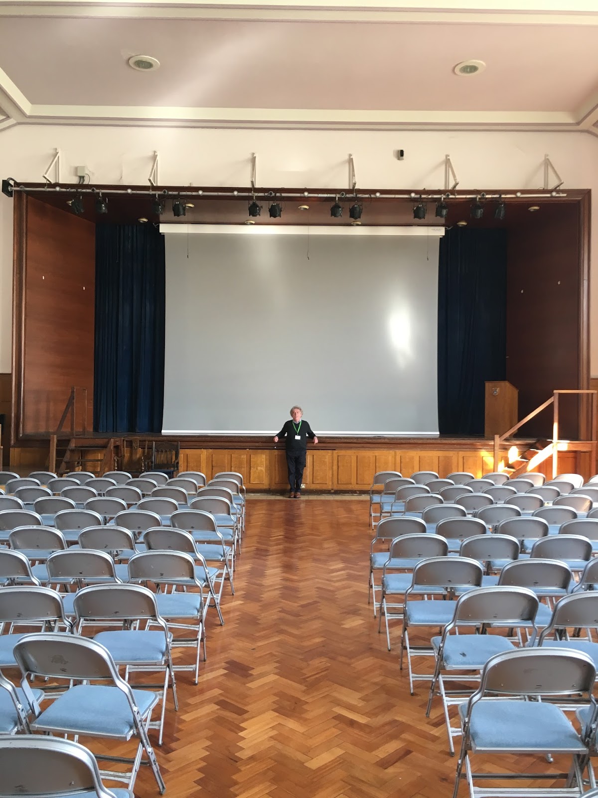 Every now and then on my tour I turned a corner and found myself whisked backwards. Different things triggered it. The corner of the playground where I once put my hand in my pocket and discovered half a crown I didn't know I had. The feeling of an 19th century bannister worn smooth by the hands of decades of boys. A leaded window though which you could look out at the same sky. The steps up to the Lecture Hall where I first recited Wilfred Owen's "Strange Meeting", a poem I still know by heart. The parquet floor of the school hall (above) where I played Troilus in "Troilus And Cressida".